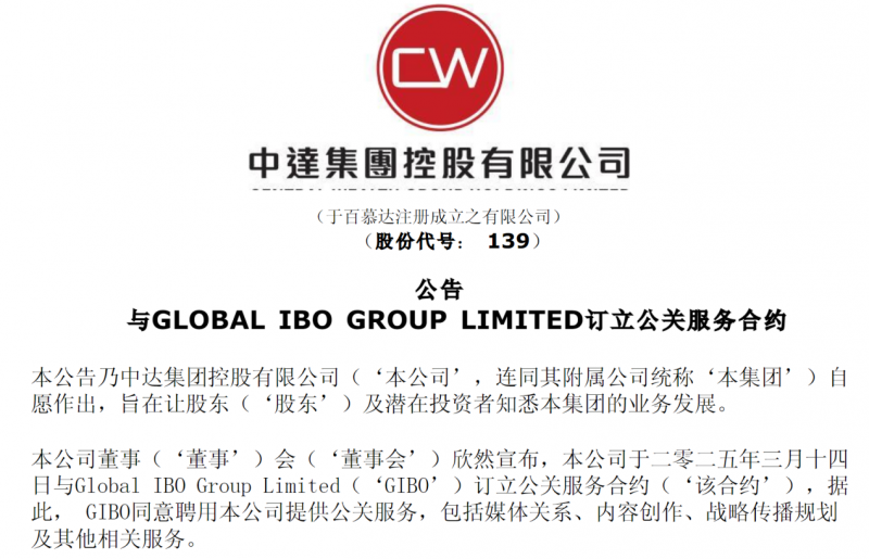 除了GIBO的股东外,最兴奋的无疑是港股的中达集团控股(HK.00139)。该公司在3月14日披露与GIBO的业务合作时,亦在公告中透漏持有GIBO的股份。