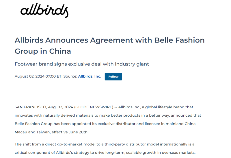 蓝鲸新闻8月6日讯(记者 王涵艺)百丽相中了在华尔街备受冷落的Allbirds。8月2日,Allbirds公告称,正式将中国区独家经营权转让给百丽时尚。该合作自2024年6月28日起正式生效,授权期限为10年,经营权包括Allbirds的产品在零售、线上和批发渠道的相关分销等。