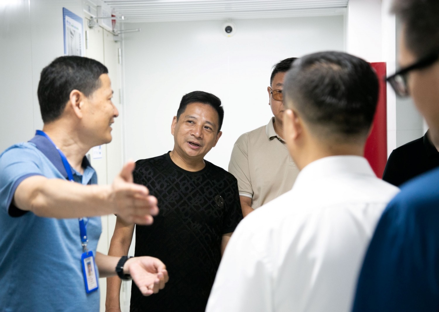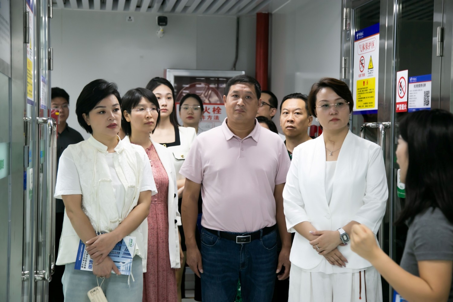 易信科技副总经理胡新文先生和市场部成伟及同事陪同企业家代表一行现场参观百旺信智算中心机房,百旺信智算中心是目前国内首个大规模面向第三方市场的智算中心,首创自研的多冷却模式弹性自适应制冷架构,突破如今大模型智算需求下智能算力群面临的热管理瓶颈,达成“三高”成效(即高功率:单机柜功率高达50KW;高算力:具备4000PFlops的智算规模;高密度:单机柜可部署2台A800设备),该项目入选工信部“国家绿色数据中心”、国家能源局“能源绿色低碳转型典型案例”、深圳市发改委“城市绿色低碳场景示范基地”、获得中国信通院“智算中心典型案例”。