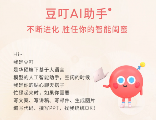 同时,它还拥有专属豆叮AI助手,基于大语言模型,带来聊天陪伴、问题解答、全能写作、AI写代码、AI PPT、AI绘图等实用功能,既能陪你聊天解闷、答疑解惑,提供情绪价值,也能生成各类风格文案、快速编写代码、制作PPT、生成图片,带来AIGC内容创作的功能性价值,成为你的全能助手。目前,华硕a豆用户都可以免费体验聊天陪伴、问题解答、全能写作以及AI写代码四项功能,无需消耗任何点数。