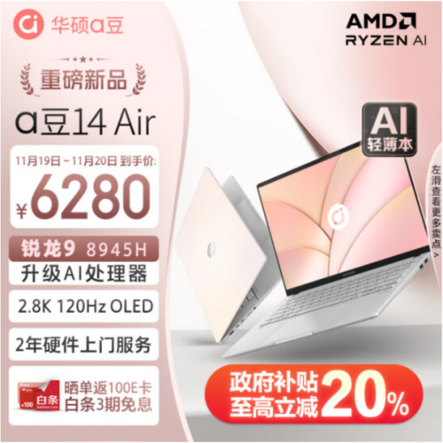 从个人助理到办公协作,从创意工具到深度创作,AI PC不仅为我们提供了高效处理复杂AI任务的硬件支持,也带来了更个性化的创作体验。华硕a豆14 Air作为一款备受好评的AI PC,不仅外观时尚亮眼,还内置AMD锐龙9 8945H处理器、豆叮AI助手,配置高能并带来高效AI体验,是年轻人购机优选。现在入手不仅支持白条3期免息+晒单返百元E卡,还可参与华硕以旧换新活动,政府补贴福利满满,天津浙江四川等多个地区用户最高立减20%,到手更值。